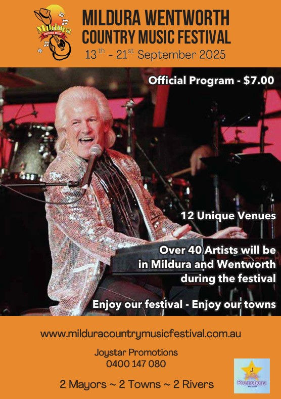 Official Program for the Mildura Wentworth Country Music Festival 2025.Over 40 Artists across 14 venues.